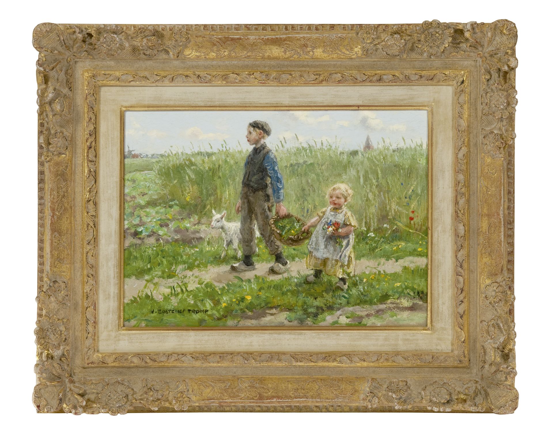 Jan Zoetelief Tromp painted most of his work in the towns of Blaricum and Katwijk. Agrarian life in Blaricum first captured his interest in 1899, and in 1905 he ‘discovered’ Katwijk, where he subsequently spent summers with his family and finally settled permanently in 1914. Tromp painted the daily lives of the fishing community, and especially pictures with children, showing them playing on the beach, shepherding goats or returning from the dunes. These scenes are all idyllic and resonate with a familial contentment that presumably reflected his own. Being both deaf and somewhat introverted, Tromp preferred to use his own wife and children as models.