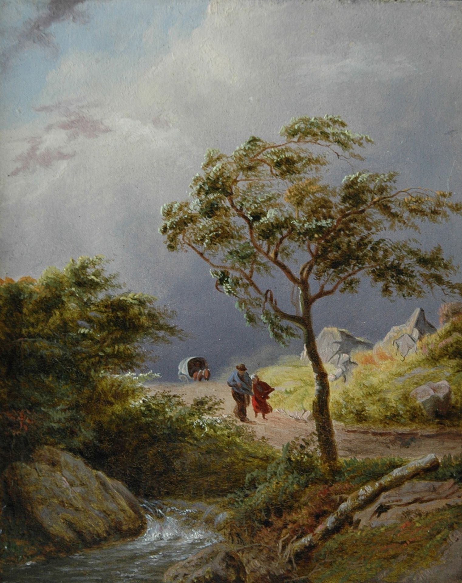 Johann Bernard Klombeck artwork • painting • previously for sale Country folk on a path in a rising storm