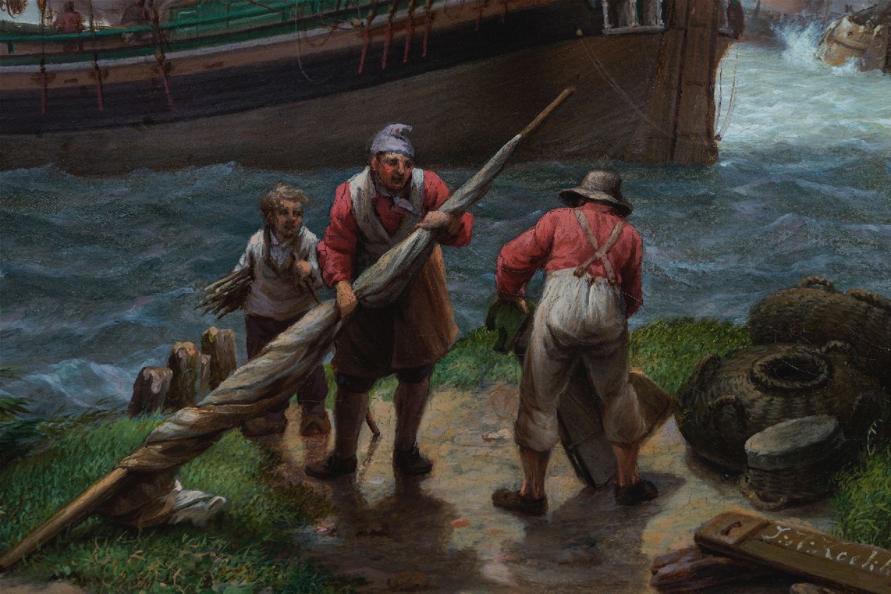 Johannes Hermanus Koekkoek is considered the founding father of the well-known Koekkoek painting dynasty. He trained at the classical oriented Drawing Academy of Middelburg while working at the wallpaper factory of Thomas Gaal. He then specialized in painting elaborately worked-out townscapes with water, and seascapes in particular. He was among the first artists of the early 19th century to be inspired by the marine painters of the Dutch Golden Age. His paintings reveal that he had a great understanding of the different types of ships that navigated Zeeland’s open waterways at the time.