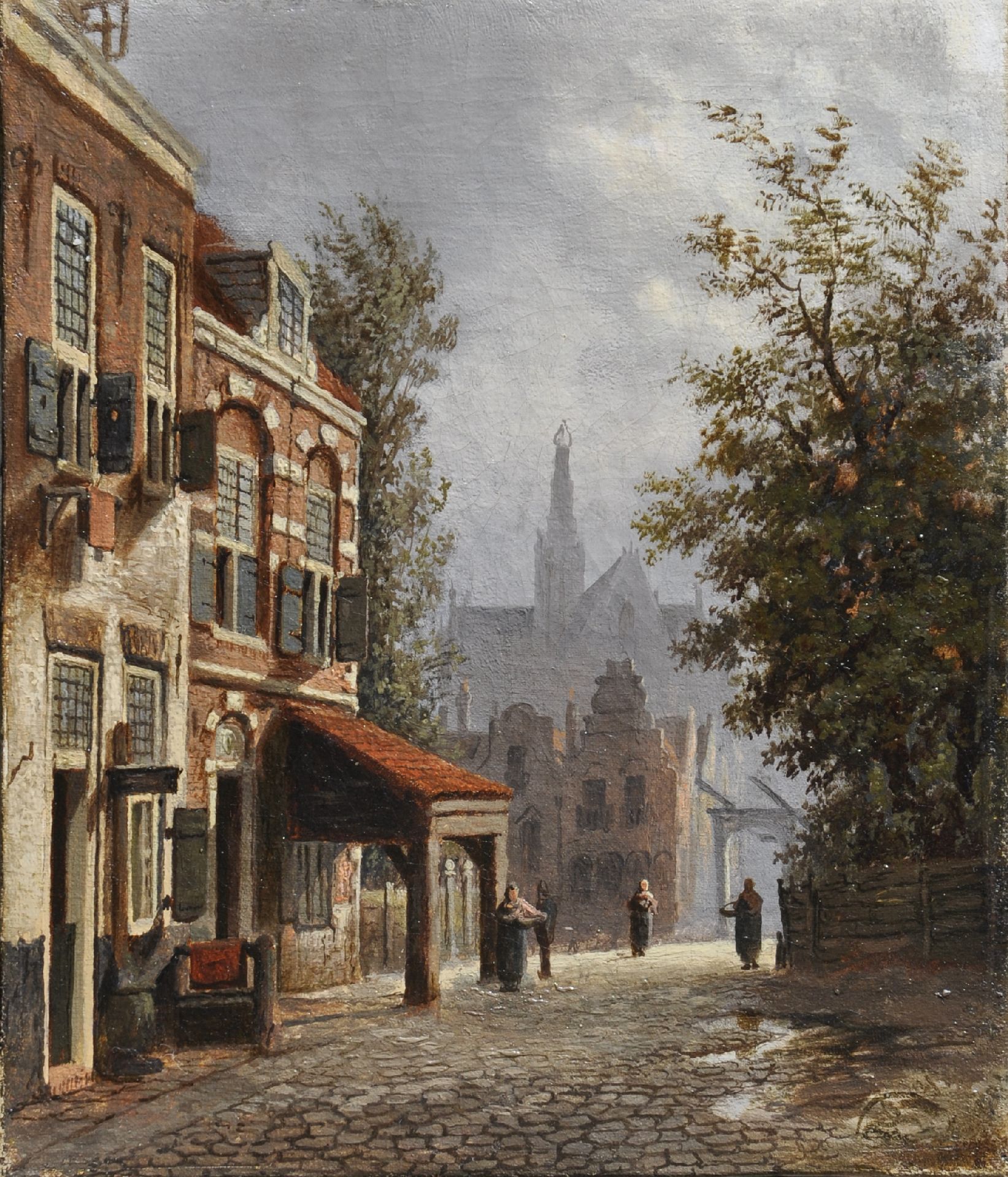 J.J. Mittertreiner was a painter of romantic village and city views in the style of Cornelis Springer, and of landscapes with buildings. Mittertreiner lived and worked almost his whole life in Amsterdam. It can be deduced from his work that he had also sought inspiration elsewhere in the country. For example, he painted the small towns around the Zuiderzee (Enkhuizen, Hoorn). Mittertreiner submitted his work in the period 1871-1882 for the annual ‘Exhibition of Living Masters’.