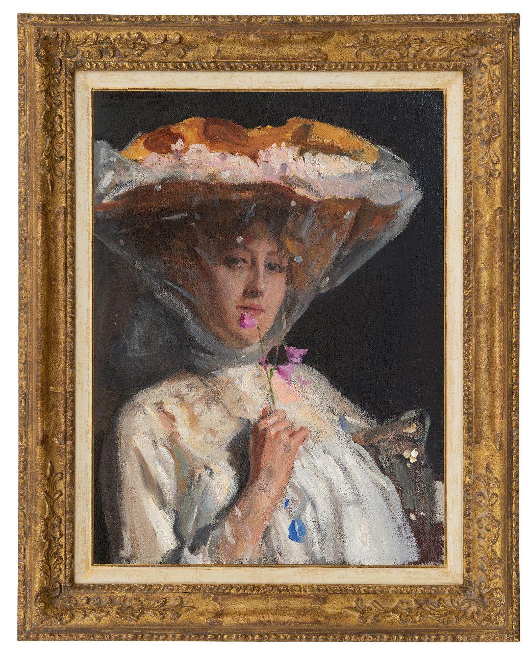 Through the academies of Munich, Rome, Naples and travels in Egypt and the United States, Oppenheimer ended up in England, where he painted in his London studio between 1896 and 1908. There he portrayed this woman in hat and veil, smelling a twig of lathyrus. Hats with voile made their appearance at the end of the 19th century. They couldn't be big and crazy enough. In addition to this elegant lady, Oppenheimer painted such celebrities as Albert Einsten, beautiful women from Europe's high society and countless film and stage actresses.
