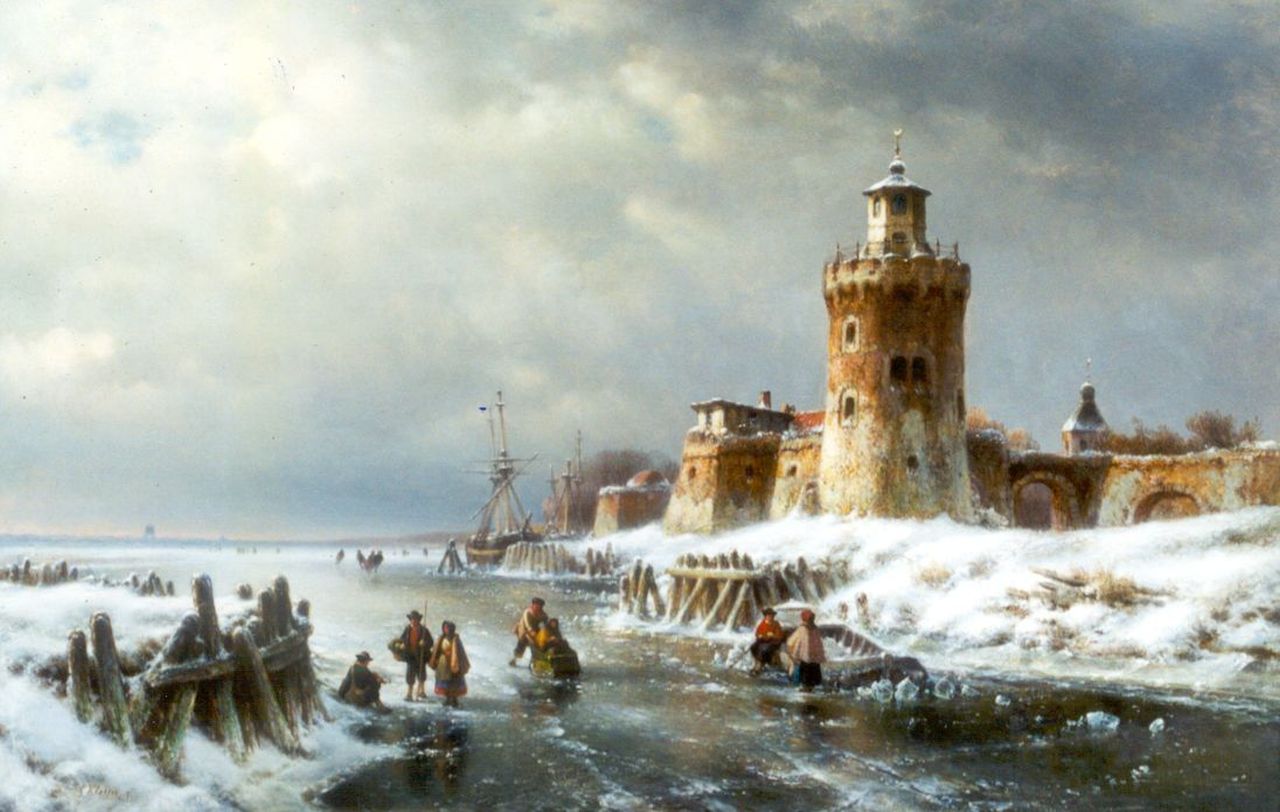 Lodewijk Johannes Kleijn artwork • painting • previously for sale Skaters on the ice by a fortified town