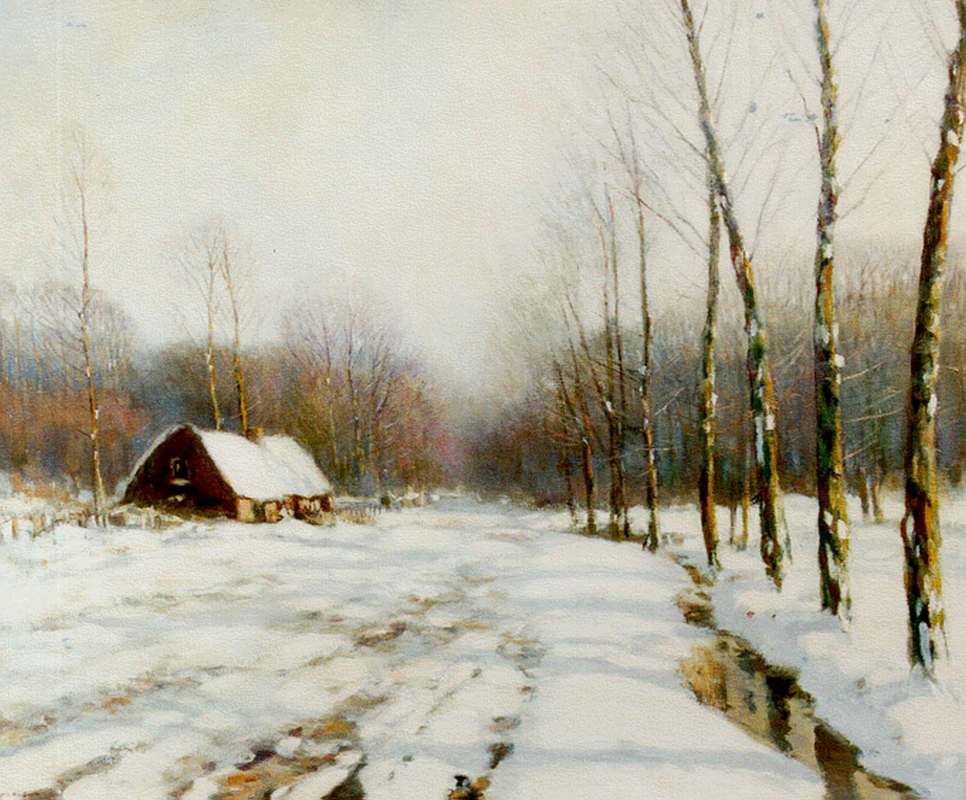 Louis van Soest was a painter of the Veluwe region in the Netherlands, active in the same circle as Jan van Vuuren and Edzard Koning. His snowy landscapes bear the stamp of a true Dutch impressionist, depicting nature sometimes blanketed in downy white with blue-toned shadows, sometimes suffused with a haze of light. Or he painted the melting snow with rivulets of water and passages of bare earth in greyish-green and brown. Van Soest's pupils included Queen Wilhelmina.