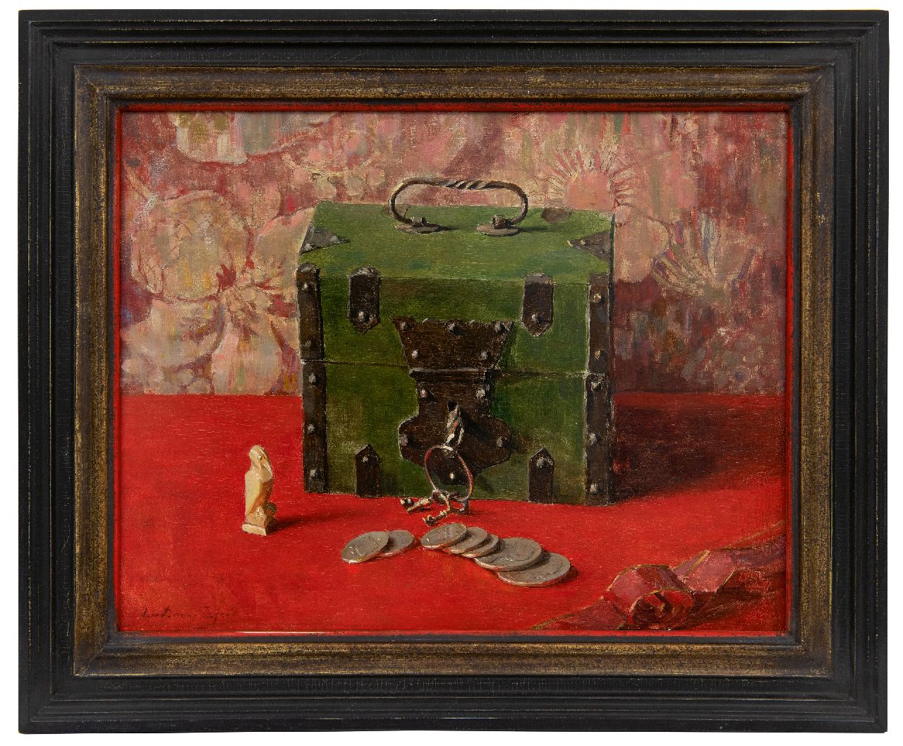 Lucie van Dam van Isselt artwork • painting • for sale Still life with a green money box