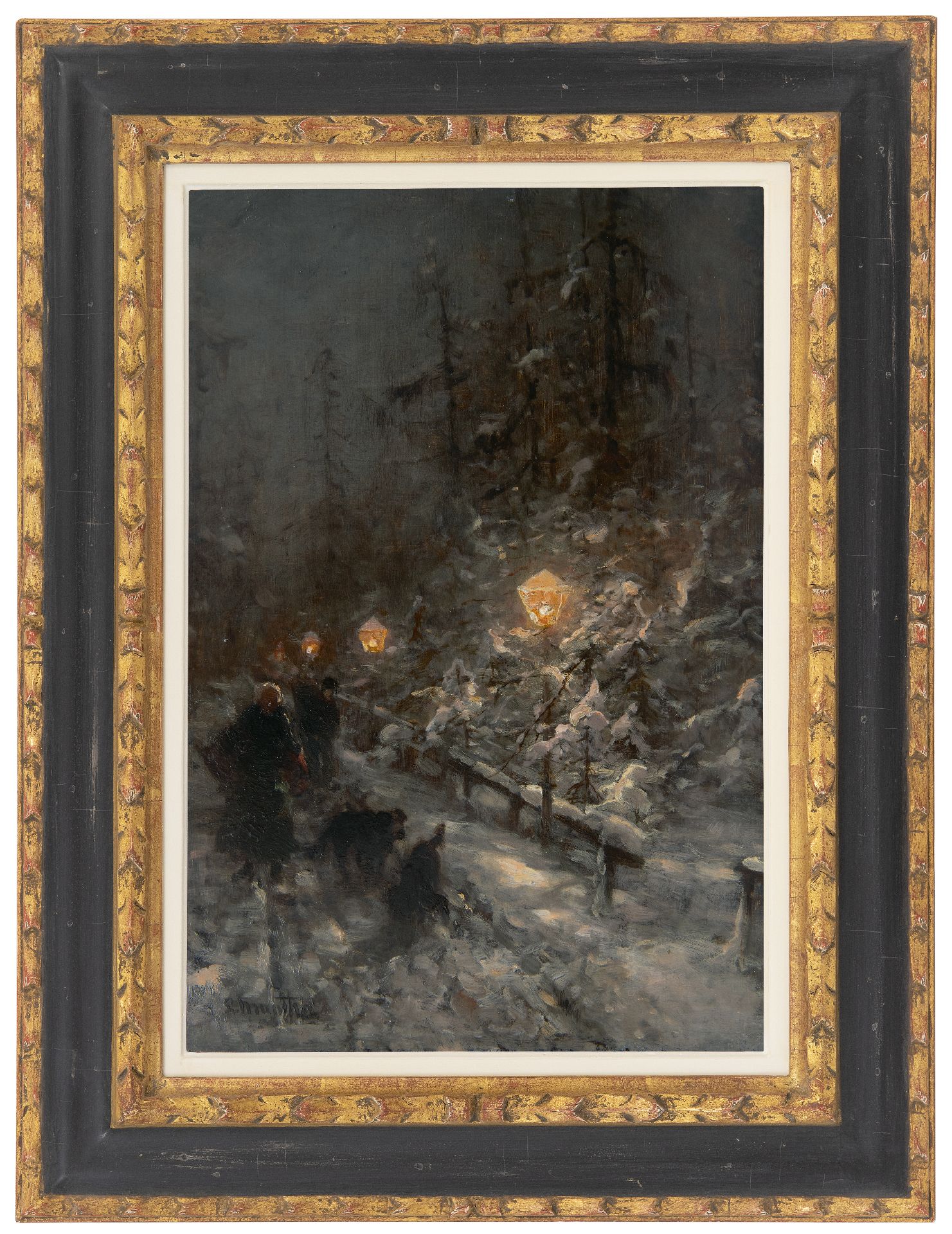 Ludwig Munthe artwork • painting • previously for sale Snowy road with figures by lamplight