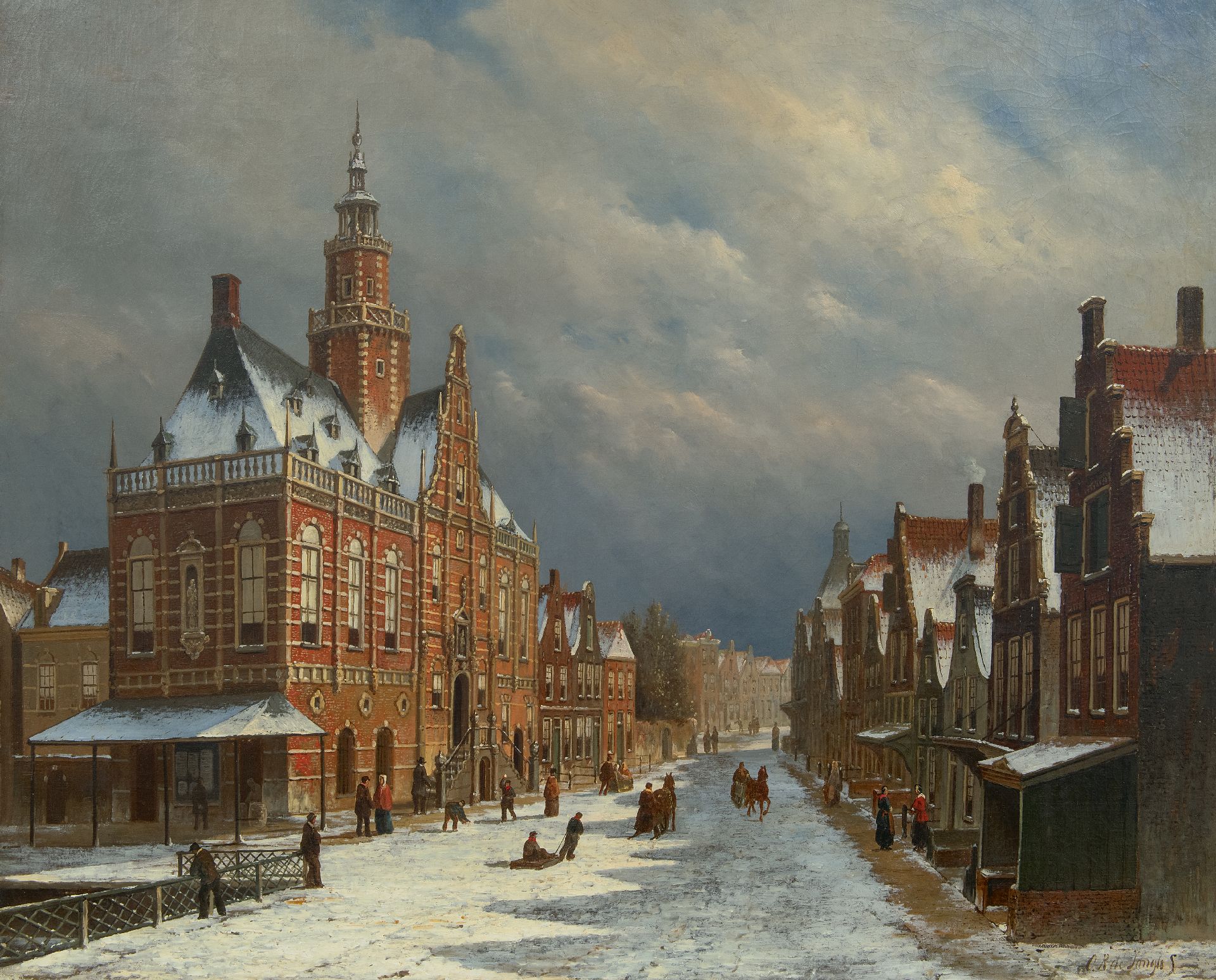 The cityscapes of Oene Romkes de Jongh show all the characteristics of the romantic Dutch cityscape as it took shape in Amsterdam in the 19th century: the accurate elaboration, the lively furnishings and the attention for old, Dutch architecture. Not much is known about the painter himself. He was born in Makkum in 1812 and probably lived and worked in Amsterdam for most of his life. There he was mainly inspired by the work of contemporary Cornelis Springer and his pupil Adrianus Eversen. The painter's oeuvre includes atmospheric city views in summer and winter, including those of Amsterdam and the Zuiderzee harbours, and a few landscapes.