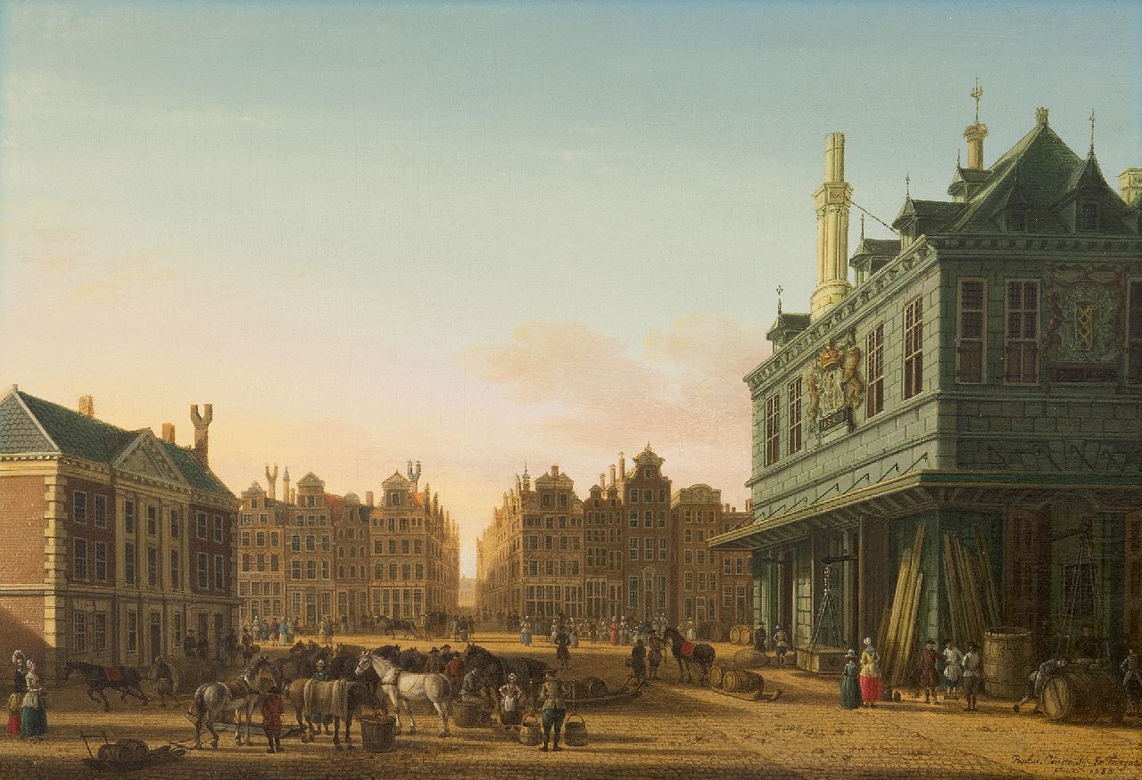 Paulus Constantijn la Fargue artwork • painting • previously for sale The Dam square in Amsterdam with the Waag and the Beurssteeg in the distance