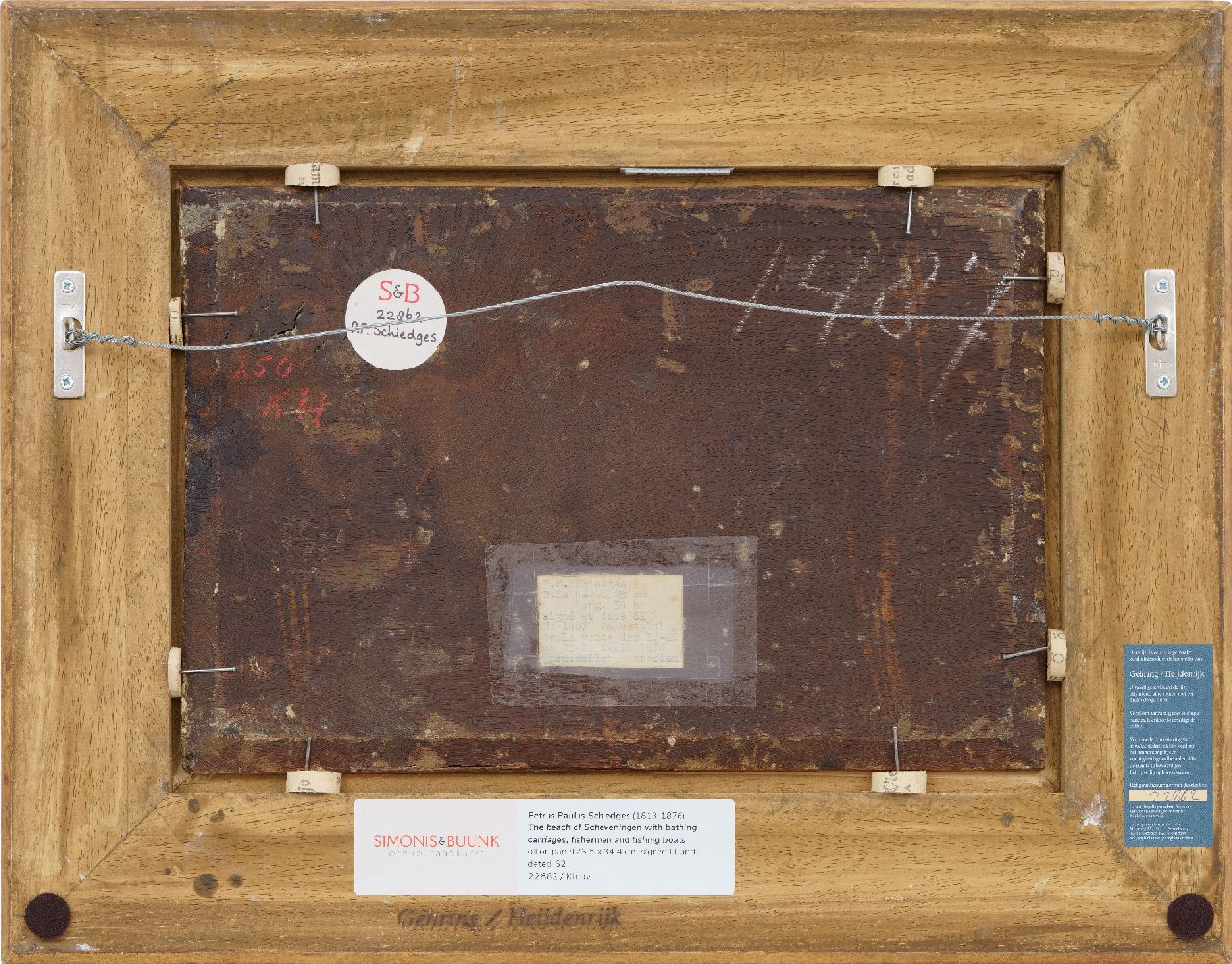 P.P. Schiedges, a painter of sea and river views, carefully studied the types of ships, which enabled him to reproduce them in the smallest detail. In this Scheveningen beach scene, he shows that other things also interested him. The funny bathing carriages, for example, which are crisscrossed on the beach in all shapes and sizes. But he also carefully depicts the row of dunes with his 'architecture parade'. On the far left is the municipal bathhouse, which opened in 1828. The Kurhaus now stands here. The red brick building next door is Hotel Garni, which was demolished in 1974. It was built on the site of the former bathhouse 'Pronkenburg' by Jacob Pronk, the 'pioneer of Dutch bathing life', had stood. The white building on the right in the distance, towards the church of Scheveningen, is the Paviljoen Von Wied. This was built in 1826 by order of King Willem I, who with this house by the sea protected the poor health of his wife Wilhelmina of Prussia hoped to improve. One of his grandchildren, Princess Marie of Orange-Nassau, inherited the pavilion in 1881. The building owes its name to her husband, Prince Wilhem von Wied. The pavilion is still there and the Museum Beelden aan Zee is now located in the dune around.