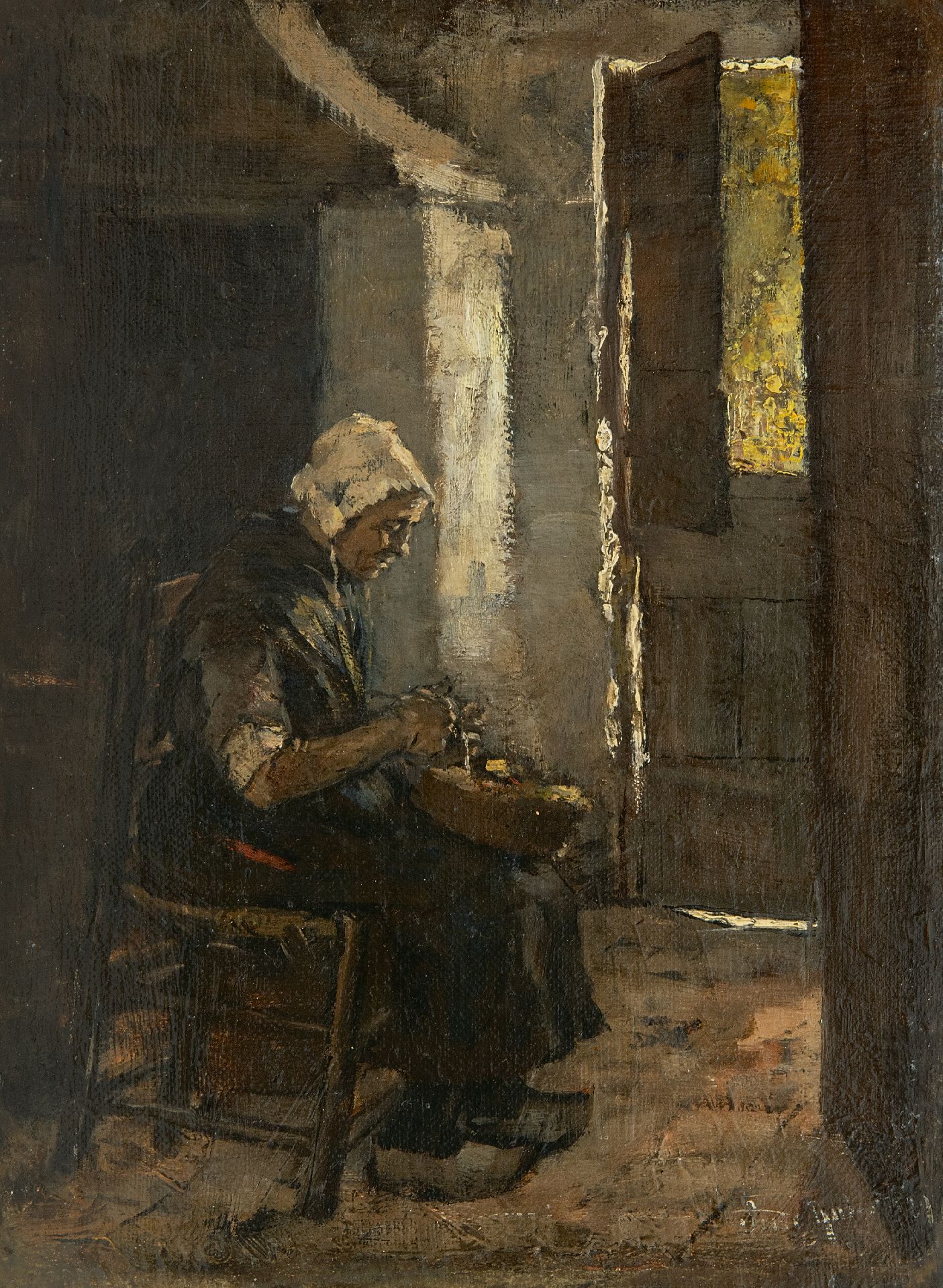 Suze Robertson artwork • painting • previously for sale Farmers wife peeling potatoes