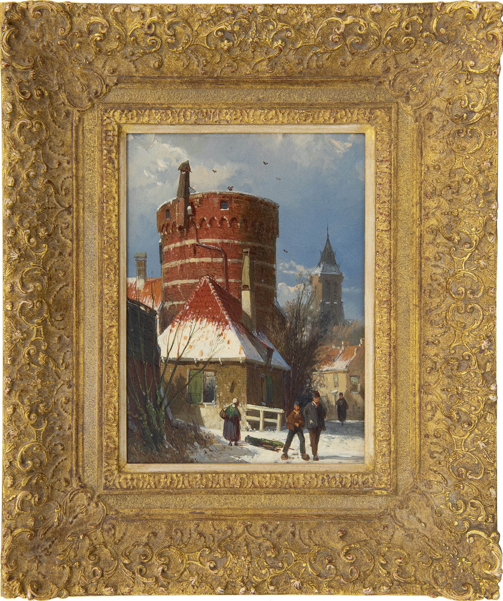 Willem Koekkoek artwork • painting • for sale Dutch street with an old fortress tower, in the snow