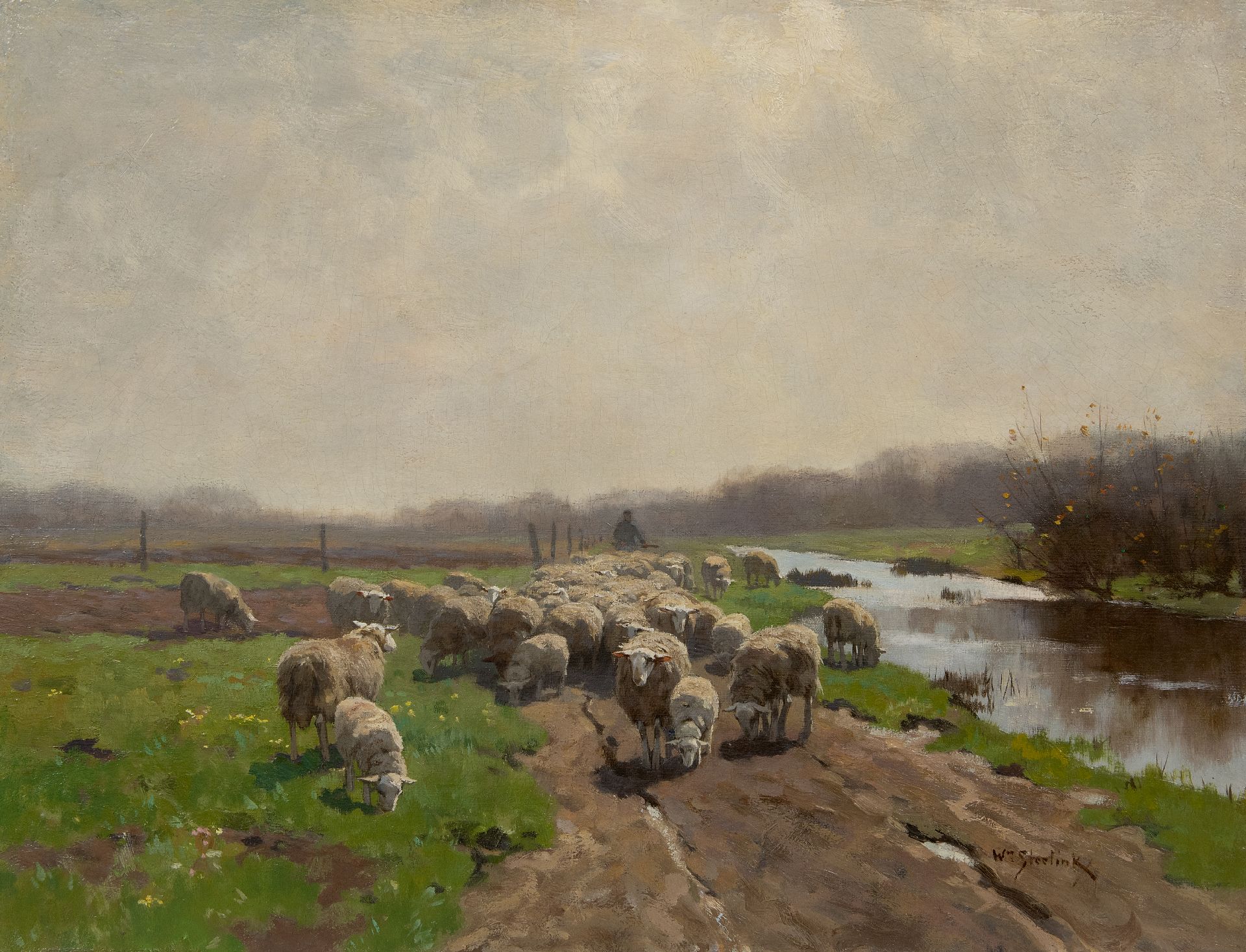 Willem Steelink is considered one of the 'successors' of Hague School painter Anton Mauve, alongside F.P. ter Meulen and H.J. van Weele. Born in Amsterdam and trained by his father in the romantic tradition as a painter of historical scenes, Steelink choose a different path after discovering the heathland of the Gooi region in 1877. In the summers, he and Hein Kever would go to Laren to paint sheep-dotted landscapes that are prized for their beautiful lighting. Eventually Steelink settled in Hilversum, and later in Scherpenzeel and Laren, in order to be closer to his beloved subject matter. There is a flourishing market for his work, also among collectors in Germany, England and Canada.