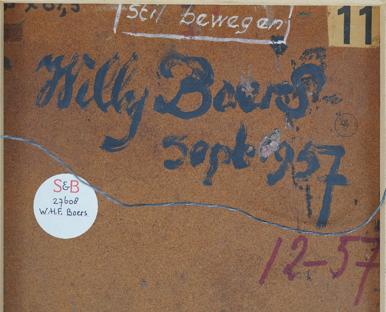 The Amsterdam painter Willy Boers was one of the key figures involved in the post Second World War renewal of visual art in the Netherlands. To this end, he became one of the co-founders of the Vrij Beelden (New Images) group in 1946, that also included Hussem, Roëde and Ouburg, and who exhibited regularly at the Stedelijk Museum, Amsterdam. Vrij Beelden painters chose to work in an abstract and experimental style, freely building on existing movements like Cubism, Surrealism and Expressionism. This was in contrast to Cobra artists, who broke away entirely from the prevailing idiom. Boers’ work became completely abstract after 1945, with evident influences from Kandinsky. In 1950, along with artists like Rooskens and Brands, he co-founded the Creation group, in which abstraction and the experimental again played a role. As well as being a naturally talented painter, he was a gifted author, writing many enlightening articles on abstract art.