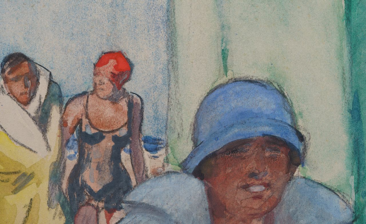 On summer days, Sluiter could be found on the beach and boulevard of the seaside resort of Scheveningen, where he made countless sketches of his own family or friends, strolling walkers and bathers. Not everyone seemed to be in the mood for a dip in the sea. Father also tries to get his daughter into the water, but she is more interested in her book. Mother, in her best beach outfit, doesn't seem to be planning to show up in a bathing suit that day. When Sluiter moves to The Hague with his family in 1916, he establishes his name with the portraits he makes of the well-to-do bourgeoisie. In addition, the leisure activities of the beau monde in The Hague will also become an important subject. In the twenties of the 19th century people became aware that fresh sea air was beneficial for physical and mental health and beach life slowly developed in the Netherlands with everything that went with it: hotels, restaurants, a kurhaus, horse or donkey riding , bathe in the sea and build sandcastles.
