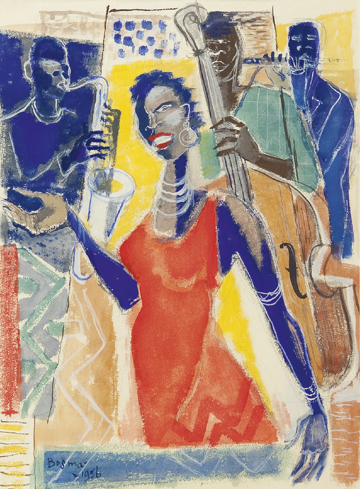 Wim Bosma was a painter with a fascination for the 'miracles' of the modern, twentieth-century machine age, with oil and watercolour paintings that feature railway viaducts, trains, boats and aircraft. Among his most famous works are stations and harbours produced in the 1930s in a New Objectivist, realistic style. His paintings of this period are also indebted to André Lhote's more Cubist works, with compositions built up from lines and blocks of colour that serve to emphasise the flatness of the canvas. After 1945 his repertoire expanded to include other types of subject matter. In 1956 he painted this impression of the American jazz singer Sarah Vaughan (1924-1990) and her trio.