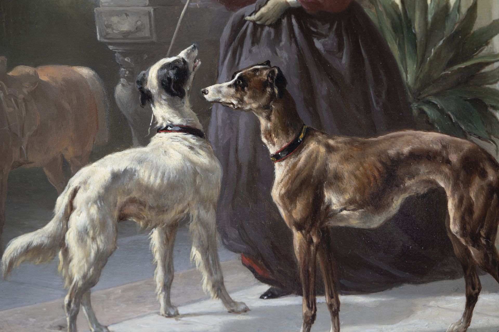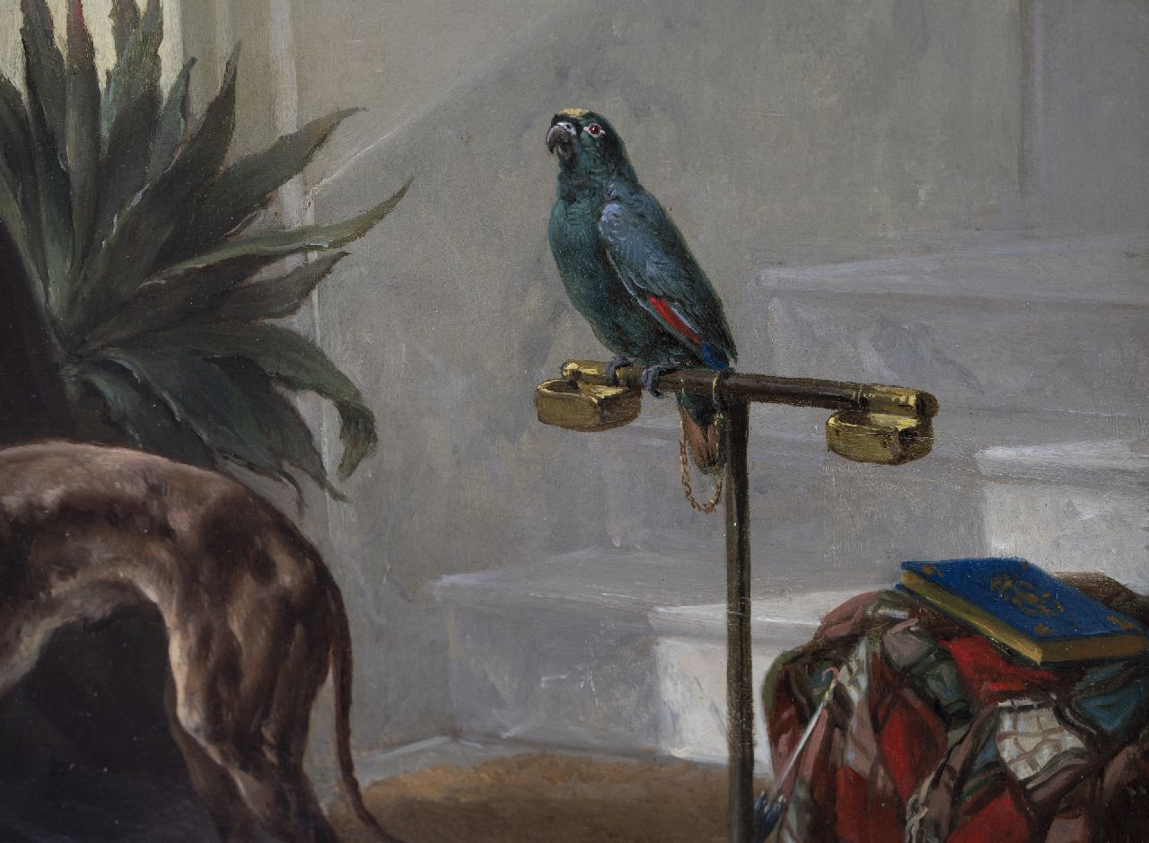 In his time Wouterus Verschuur was an acclaimed painter of horses. From his teacher, the livestock artist P.G. van Os, he learned to capture their physique and movement to perfection. As a true-born romanticist he was also interested in their character, thereby painting powerful carthorses in their stable, thoroughbred saddled horses during an afternoon ride or harnessed horses in action. Verschuur was also a great painter of dogs and these appear in most of his paintings. The painter lived in Haarlem between 1858 and 1868, where he taught Anton Mauve. He also instructed his son Wouterus Jr, who like his father specialized in painting horses.