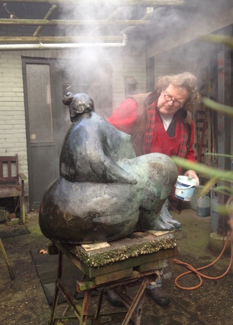 Cast and finished bronze is gold colored, but the oxidation in the outdoor air makes it black, green, gray. To speed up that process and keep it in your own hands, the image is patinated. With the help of a gas burner and various chemicals, the image is, as it were, colored, in the desired patina – a laborious and unhealthy process. Finally, the sculpture is provided with a layer of beeswax to fix the patina.