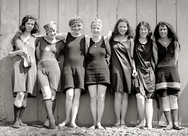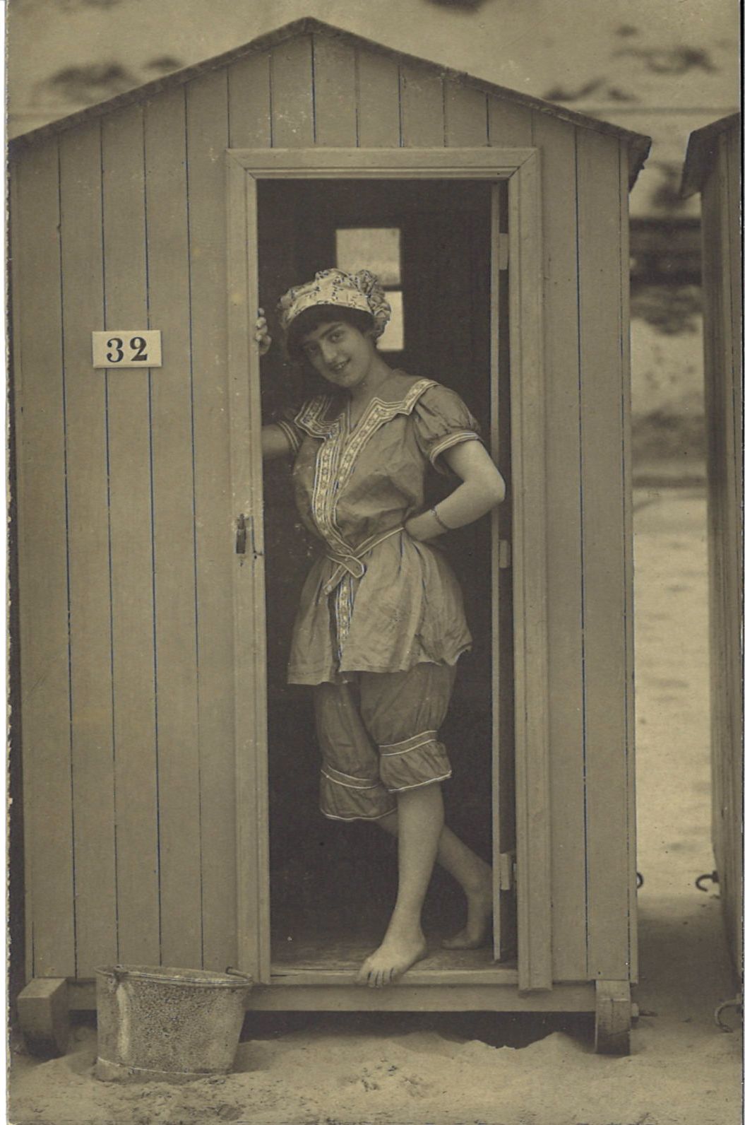 From 1870, real swimwear started. Bathing suits, which had to cover the body as chastely as possible, consisted of a one-piece, red and white striped or plain dark bathing suit, with knee-length legs and short sleeves, for men. Women entered the water with much more clothing. The shape of their bathing suit was borrowed from the “Bloomer suit”, over-the-knee puffer trousers with a roomy tunic shirt or a top with a knee-length skirt over it. For girls a white dress, including a shirt and pants with long legs, for boys sailor suits with long or short pants and long stockings. Later, when the sailor look – blown over from England – was hugely popular, girls’ swimwear was replaced with a knee-length pleated sailor skirt or dress. Recreational sunbathing in swimwear gradually became established in the West and the images of tanned celebrities in newspapers, films and television contributed a lot to this. Dress standards relaxed and the two-piece swimsuit made its appearance. Under the influence of movie stars, and thanks to a changing morale, the bikini was widely accepted in the 1960s and topless around 1965. But times are changing and there are now enough reasons to no longer walk around topless on the beach. The sexualization of the body – bare breasts and sex – are often linked together. The rise of social media, which puts you at risk of being photographed and shared with half the world, is contributing to the increasing prudery. Who knows, we may be dressing again soon in a bath wagon instead of bumbling behind that bath towel.