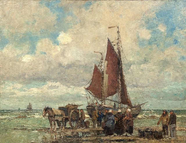 Johannes Evert Akkeringa | Unloading the fishing boats on Scheveningen beach, oil on panel, 26.6 x 40.1 cm, signed l.r. and painted ca. 1901